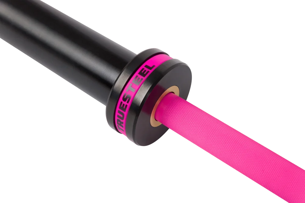 Nejenže růžové čepičky na konci osy vypadají luxusně, ale díky jasnému označení váhy a průměru okamžitě víš, kolik zvedáš.
